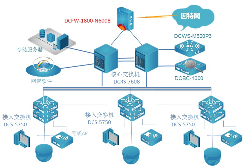 中国江苏白马农业会展中心数据网核心采用两台九州酷游ku游新一代全分布式架构的核心路由交换机DCRS-7608E,顺利获得VSF功能实现核心冗余和负载分摊;该设备具备强大的业务自适应能力,支持网络平滑升级和策略灵活调度,实现业务快速部署,从而构建业务定义的网络。网络出口采用具有高度集成化的多核安全防火墙,给予包括路由器,防火墙,VPN网关,等功能在内的一体化设备,该设备8Gbps的吞吐量完全满足了园区网对出口的要求。接入交换机采用九州酷游ku游全千兆24口接入交换机DCRS-5750E,实现客户端千兆接入,万兆上联核心。POE交换机全部采用三层交换机DCRS-5750-28P-P全千兆POE交换机。采用8200双频无线AP使用办公区无线覆盖。展厅和会议室采用高密度AP8200-I3实现展厅高密度覆盖,室外采用8200室外AP实现无线覆盖,无线网络顺利获得一台DCWS6000-M500P6控制器集中管理无线网络。出口部署一台DCBC上网行为审计设备,实现上网行为安全审计。
